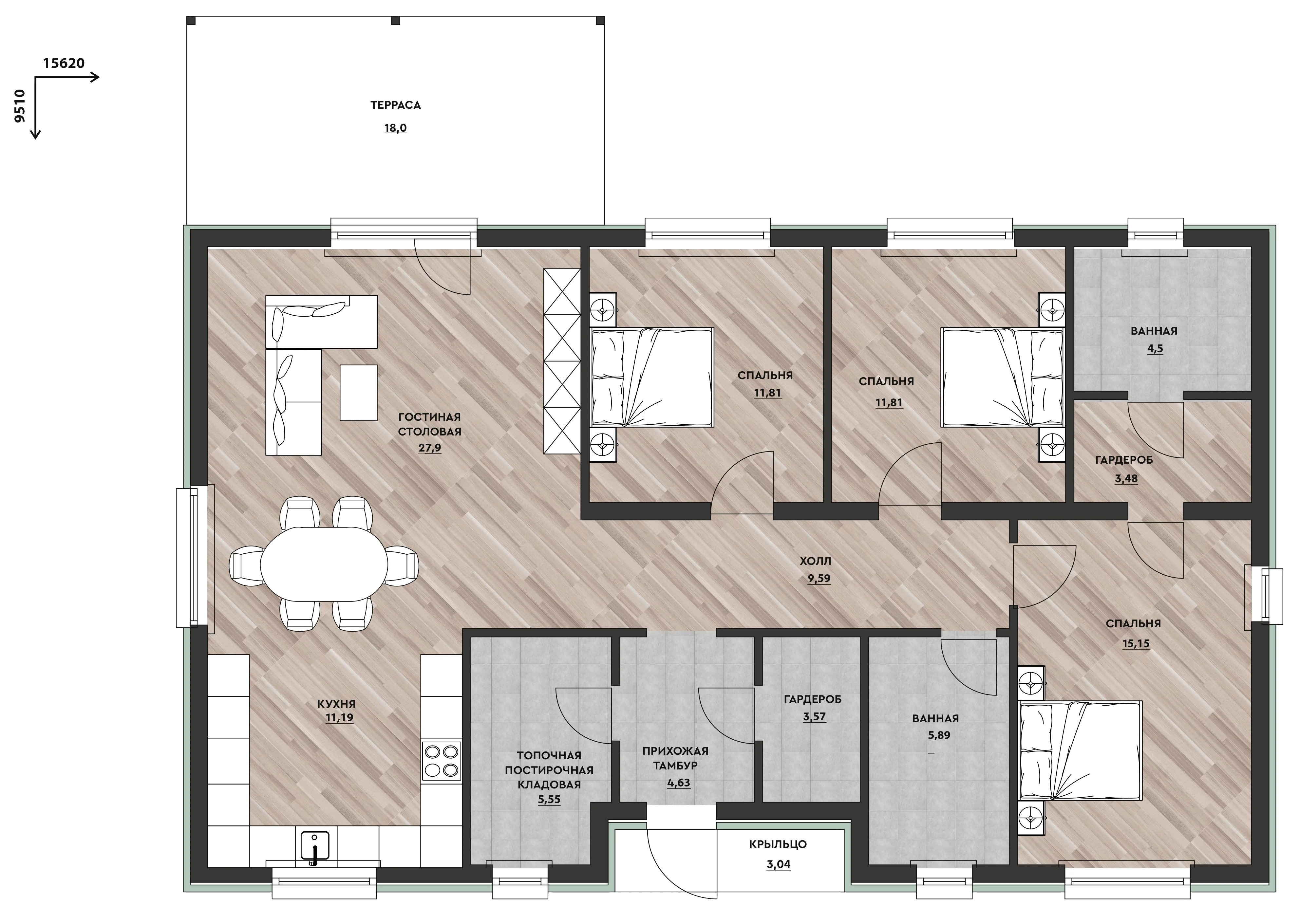 Габариты дома: 15,62 х 9,51m