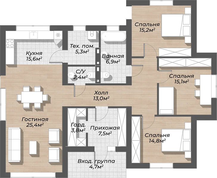 - Фасад - облицовочный кирпич или мокрый фасад, планкен